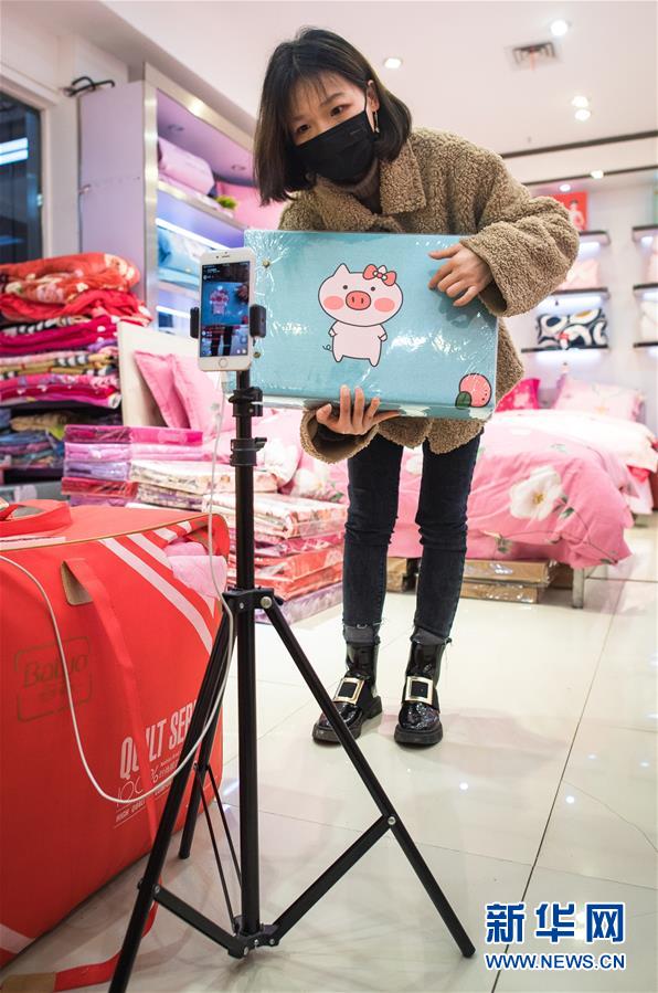 3月29日,在漢口北市場,一名主播在直播平臺直播銷售床上用品。新華社記者肖藝九攝