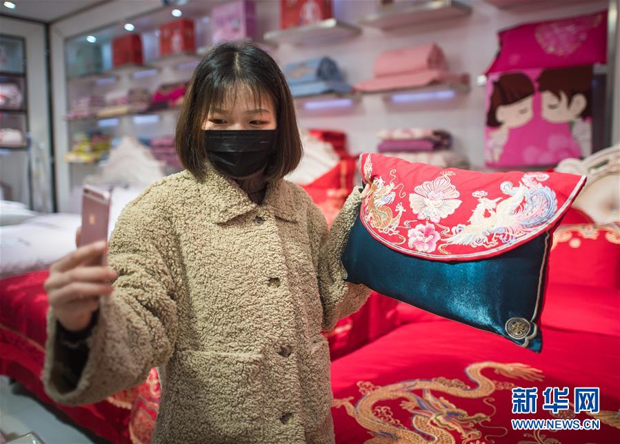 3月29日,在漢口北市場,一名主播在直播平臺(tái)直播銷售床上用品。新華社記者肖藝九攝