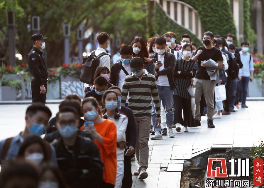 見(jiàn)圳客戶端·深圳新聞網(wǎng)2020年3月19日訊 下班時(shí)間,深圳地鐵一號(hào)線深大站A3出口外,下班后的市民在站外排大排長(zhǎng)龍,依次有序進(jìn)入地鐵站乘坐列車回家。