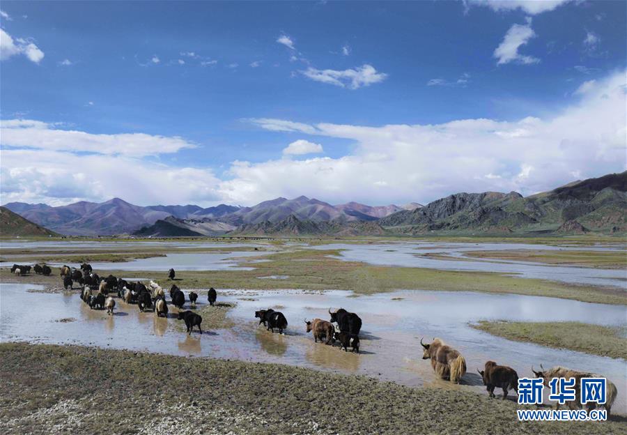 一群牦牛走過(guò)藏北濕地(2018年9月7日攝)。新華社記者普布扎西攝