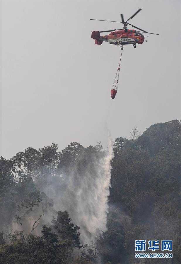 4月1日,一架卡-32大型直升機(jī)在西昌森林火災(zāi)現(xiàn)場撲火。新華社記者江宏景攝
