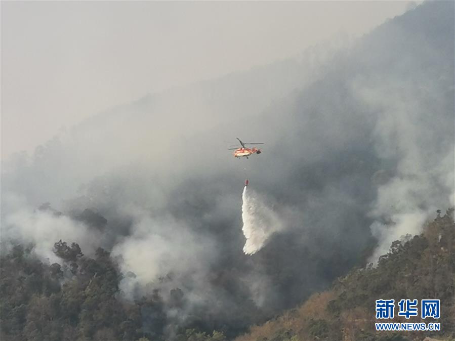 4月1日,救火直升機(jī)在西昌森林火災(zāi)現(xiàn)場滅火(手機(jī)拍攝)。新華社記者惠小勇攝