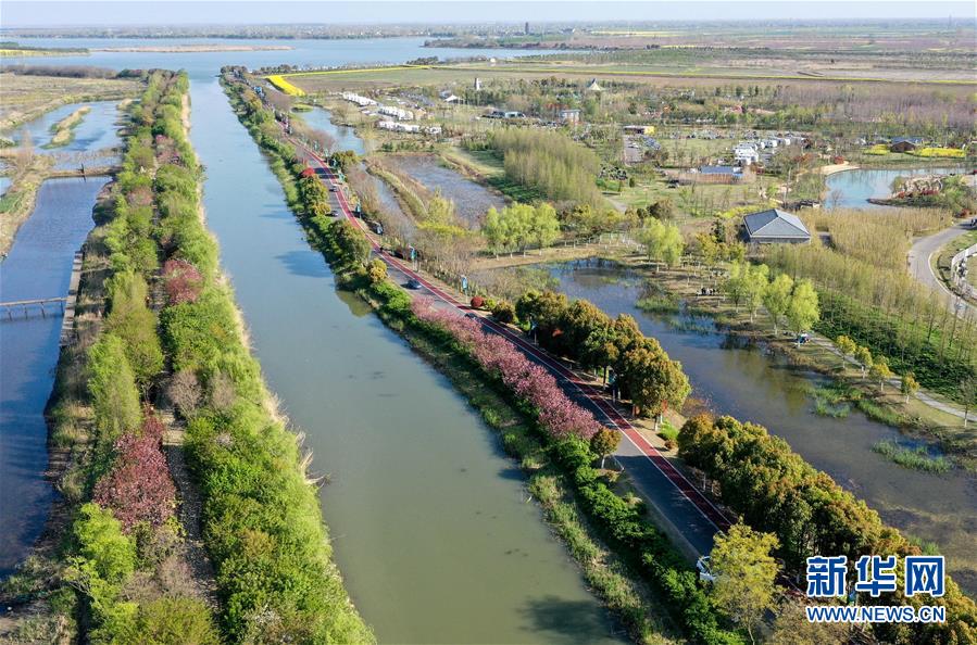 這是4月6日拍攝的白馬湖風光(無人機全景照片)。近日,江蘇省淮安市白馬湖畔春花綻放,景色怡人。白馬湖地處淮河流域下游,東貫大運河,西倚洪澤湖,南北分別銜接淮河入江水道和入海水道,湖泊水域面積113平方公里,是全國15個生態(tài)良好重點保護湖泊之一。  新華社記者 楊磊 攝
