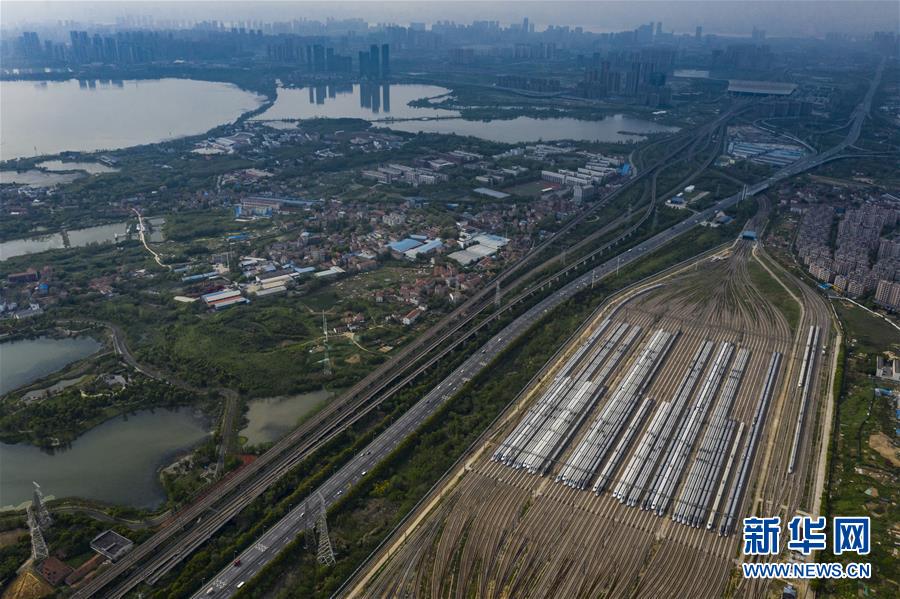 4月7日,在武漢動(dòng)車段,列車停靠在存車線上(無(wú)人機(jī)照片)。 新華社記者 肖藝九 攝