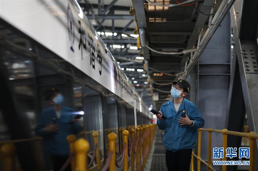 4月7日,武漢動(dòng)車段運(yùn)用車間綜合檢修班工長(zhǎng)楊磊在檢查車輛情況。 新華社記者 沈伯韓 攝
