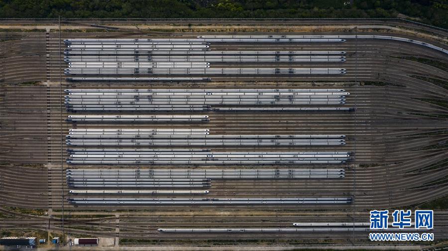 4月7日,在武漢動(dòng)車段,列車??吭诖孳嚲€上(無人機(jī)照片)。新華社記者 沈伯韓 攝