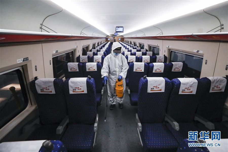 4月7日,武漢動(dòng)車段運(yùn)用車間工作人員周明輝在給列車消毒。新華社記者 沈伯韓 攝