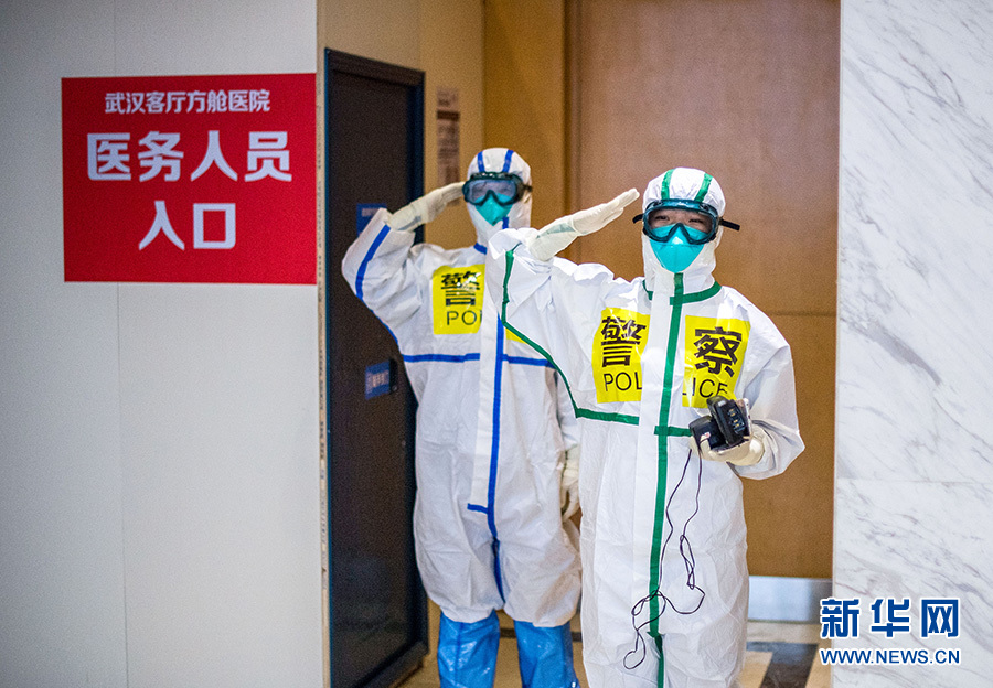 2月25日,在武漢客廳方艙醫(yī)院,來(lái)自武漢市東西湖區(qū)公安分局的民警張錦星(右)與同事劉晨在進(jìn)方艙前向同事敬禮。 新華社記者 肖藝九 攝