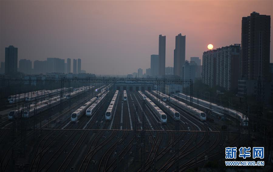 4月8日,在武漢動車段,列車??吭诖孳嚲€上準(zhǔn)備投入運行。 新華社記者 肖藝九 攝