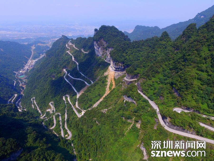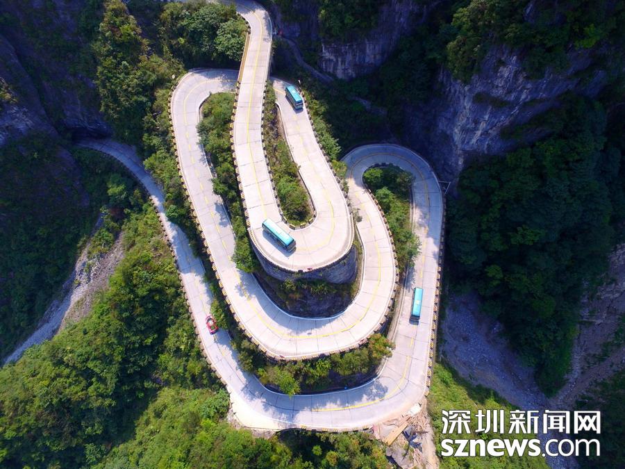 天門(mén)山盤(pán)山公路位于湖南省張家界市境內(nèi)的國(guó)家森林公園天門(mén)山上,盤(pán)山公路全長(zhǎng)10.77公里,海拔從200米急劇提升到1300米,大道兩側(cè)絕壁千仞,空谷幽深,共計(jì)99個(gè)彎,180度急彎此消彼長(zhǎng),似玉帶環(huán)繞,航拍鏡頭下蜿蜒曲折的道路彎彎緊連,層層迭起,宛如迷宮般的“納斯卡線(xiàn)條”,被譽(yù)為“天下第一公路奇觀”,同時(shí)它也是世界上最危險(xiǎn)的十大公路之一。