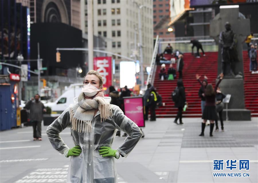3月19日,一名戴口罩的女子在美國紐約曼哈頓時報(bào)廣場拍照。新華社記者王迎攝
