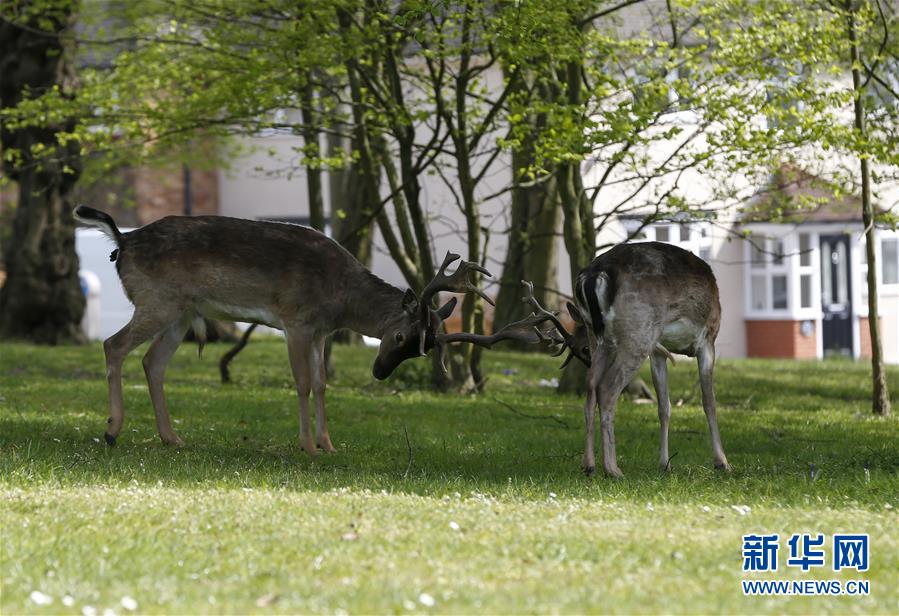 4月8日,在英國倫敦東部一個居民區(qū),附近公園里的鹿在草坪上駐足。隨著新冠疫情在英國的擴散,政府要求人們減少不必要的外出。倫敦東部一個居民區(qū)附近公園里原來散養(yǎng)的鹿紛紛從公園走出來,或吃草或接受附近居民的喂食,成為特殊時期居民區(qū)里的新“客人”。新華社記者韓巖攝