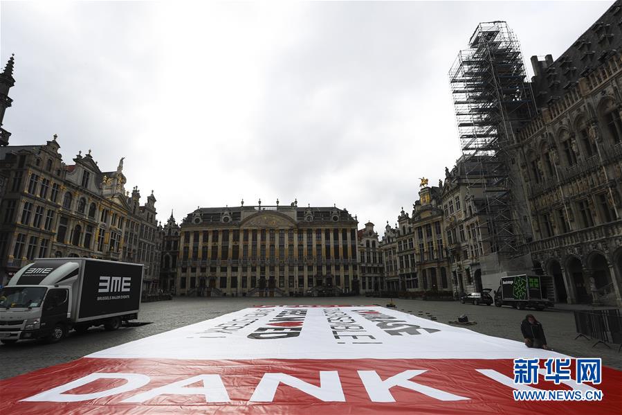 這是4月13日在比利時布魯塞爾大廣場拍攝的為抗擊疫情加油的巨幅海報。當(dāng)日,比利時布魯塞爾市政府工作人員在市中心的大廣場展開一面巨幅海報,上面用法語和荷蘭語印著“一起鼓起勇氣”“謝謝”,以感謝市民及醫(yī)療人員為抗擊疫情所做的努力。新華社記者鄭煥松攝