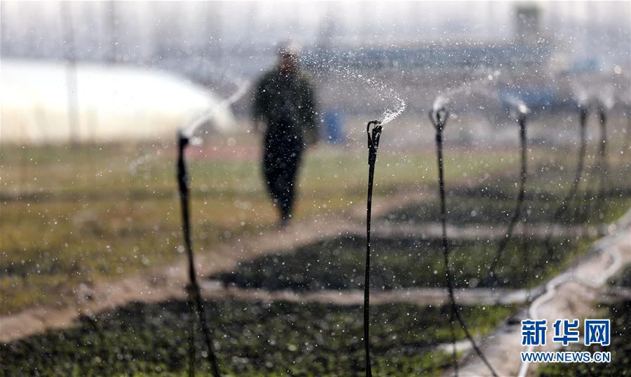 4月13日,在八角臺街道雅化村,一處剛剛培育的花圃進行灌溉。