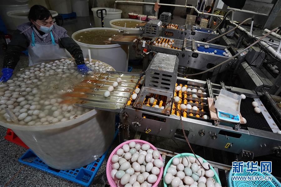 江蘇高郵鴨集團(tuán)的工作人員在生產(chǎn)車間內(nèi)清洗分揀鴨蛋(4月15日攝)?!案哙]鴨蛋”是江蘇高郵的特色農(nóng)業(yè)名片。近年來,當(dāng)?shù)卦诹挤N繁育、生態(tài)養(yǎng)殖、產(chǎn)品加工等方面加大力度,推動高郵鴨蛋品牌化建設(shè),讓小鴨蛋成為帶動農(nóng)戶致富的大產(chǎn)業(yè)。2019年,高郵市共計(jì)生產(chǎn)熟制鴨蛋產(chǎn)品近11.2億枚,年產(chǎn)值近17.68億元。新華社記者韓瑜慶攝
