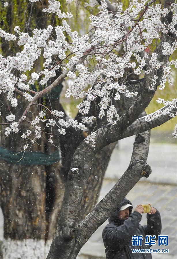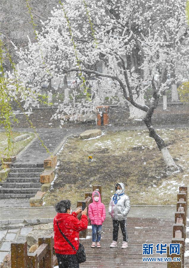 4月21日,市民在長(zhǎng)春市杏花村公園觀賞雪景。當(dāng)日,吉林省多地迎來(lái)降雪天氣。新華社記者許暢攝