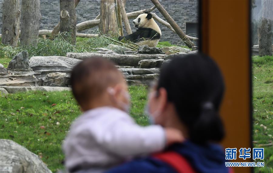 4月22日,大熊貓迎來參觀的游客。當日,在嚴格落實疫情防控措施的前提下,武漢動物園有序恢復開放。新華社記者程敏攝