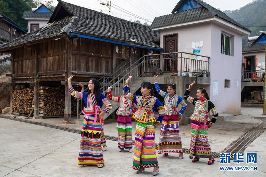 4月10日,在云南省勐海縣布朗山鄉(xiāng)曼囡村曼班三隊,娜四(中)和村民一起跳舞。新華社記者胡超攝