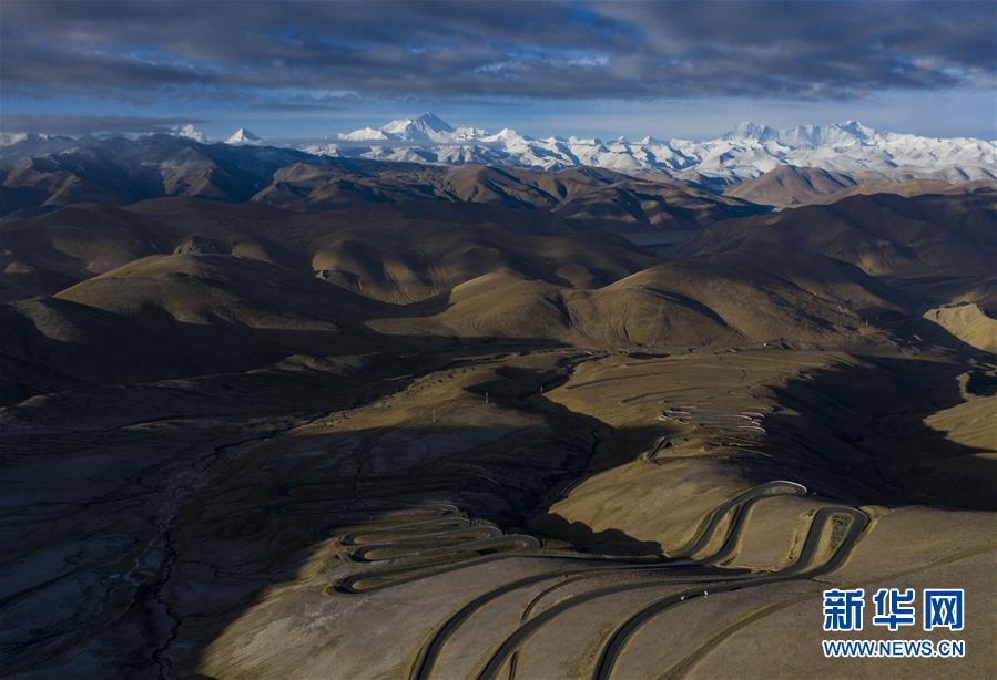 日出時(shí)分,在加烏拉山口拍攝的前往珠峰的道路(4月25日攝)。新華社記者普布扎西攝