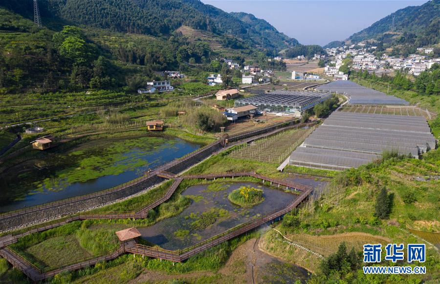 這是4月29日拍攝的四川珙縣三合村現(xiàn)代農(nóng)業(yè)產(chǎn)業(yè)示范園區(qū)及旅游休閑設施(無人機照片)。