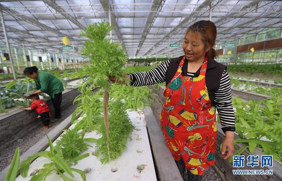 4月29日,珙縣三合村的村民在現(xiàn)代農(nóng)業(yè)產(chǎn)業(yè)示范園區(qū)收獲無(wú)土栽培的蔬菜苦菊。新華社記者江宏景攝