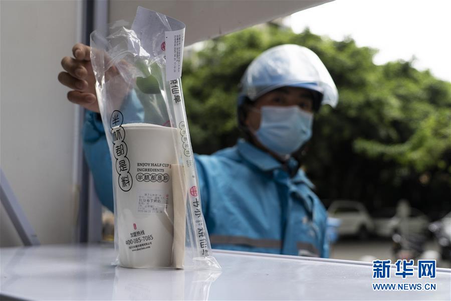 4月22日,在四川省成都市的一家小區(qū)無接觸配送點(diǎn),邱有哈子配送奶茶。新華社記者 李夢馨 攝
