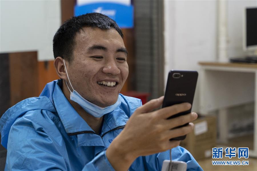 4月22日,在四川省成都市的一家外賣配送站點(diǎn),邱有哈子在與家人視頻聊天。新華社記者 李夢(mèng)馨 攝