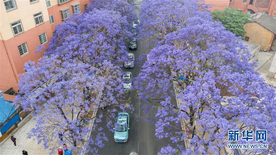 這是5月2日在昆明市教場中路拍攝的藍(lán)花楹(無人機照片)。近日,云南省昆明市部分街區(qū)的藍(lán)花楹競相開放,為春城增添靚麗風(fēng)景。新華社記者藺以光攝