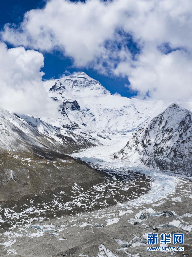 位于珠穆朗瑪峰腳下海拔5400米左右的中絨布冰川(4月30日攝,無(wú)人機(jī)照片)。位于珠穆朗瑪峰腳下海拔5400米左右的中絨布冰川,巍峨壯觀,冰塔林托起世界最高峰,讓人嘆為觀止。新華社記者普布扎西攝