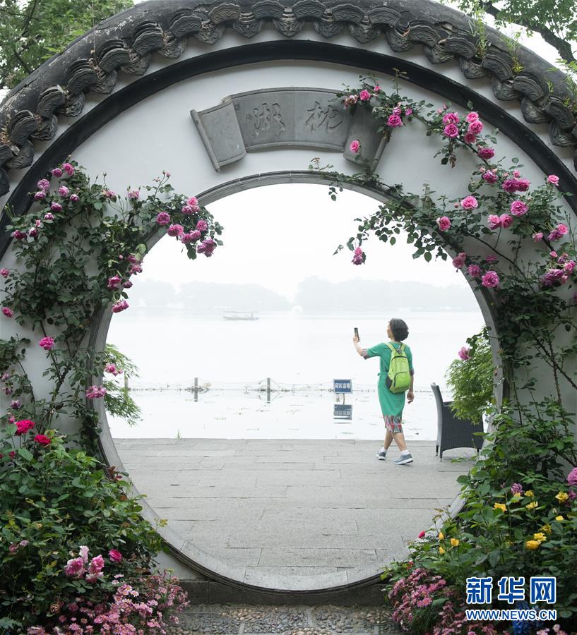 5月5日,游客在西湖畔的郭莊觀看月季花展?!拔逡弧逼陂g,第八屆杭州西湖月季花精品展在杭州西子湖畔舉行,展出國內(nèi)外700余個(gè)月季品種。新華社記者翁忻旸攝