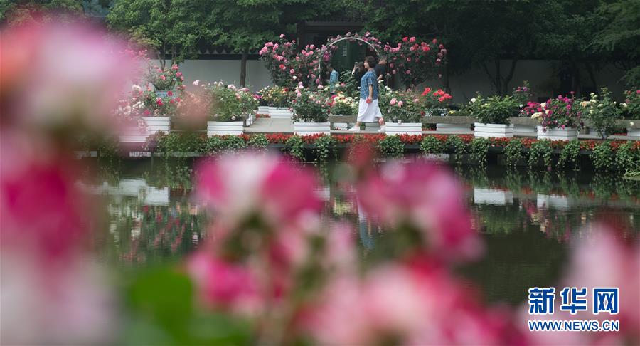 5月5日,游客在西湖畔的杭州花圃觀看月季花展。“五一”期間,第八屆杭州西湖月季花精品展在杭州西子湖畔舉行,展出國內(nèi)外700余個月季品種。新華社記者翁忻旸攝