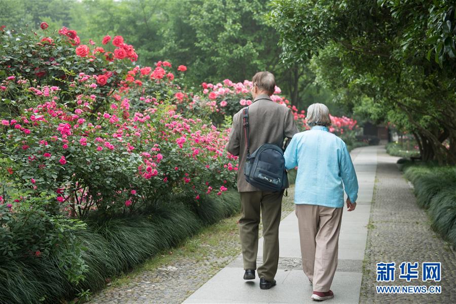 5月5日,游客在西湖畔的郭莊和月季合影?!拔逡弧逼陂g,第八屆杭州西湖月季花精品展在杭州西子湖畔舉行,展出國內(nèi)外700余個月季品種。新華社記者翁忻旸攝