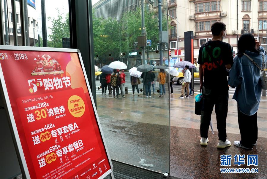 上?;春B芬患疑虉?chǎng)布置的“五五購(gòu)物節(jié)”活動(dòng)信息(5月5日攝)。5月4日晚,上海首次啟動(dòng)大規(guī)模商業(yè)促銷(xiāo)活動(dòng)“五五購(gòu)物節(jié)”,多家在線新經(jīng)濟(jì)企業(yè)參與,通過(guò)線上流量?jī)?yōu)勢(shì)反哺線下賣(mài)場(chǎng),實(shí)現(xiàn)電商與實(shí)體零售融合互動(dòng),激活消費(fèi)潛力、驅(qū)動(dòng)消費(fèi)復(fù)蘇。據(jù)“上海發(fā)布”的消息,截至5日14時(shí)12分,“五五購(gòu)物節(jié)”上海地區(qū)消費(fèi)支付總額已超100億元。新華社記者劉穎攝