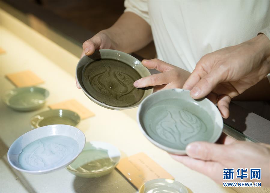 5月8日,“90后”瓷人湯佳(左)將自己制作的魚紋盤帶到龍泉青瓷裝飾紋樣研究所,跟項宏金收藏的古瓷器比對。1965年出生的項宏金,被浙江龍泉年輕一代瓷人稱為“項哥”,他從20世紀(jì)90年代開始收集龍泉青瓷標(biāo)本,研究青瓷紋樣。2014年出版著作《龍泉青瓷裝飾紋樣》,次年開設(shè)龍泉青瓷裝飾紋樣研究所,將自己收藏的千余件標(biāo)本跟瓷器愛好者、創(chuàng)作者免費(fèi)分享。新華社記者翁忻旸攝