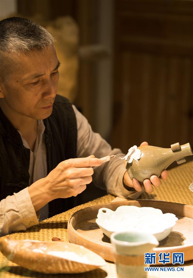 5月8日,項宏金在龍泉青瓷裝飾紋樣研究所修復(fù)古瓷器。1965年出生的項宏金,被浙江龍泉年輕一代瓷人稱為“項哥”,他從20世紀(jì)90年代開始收集龍泉青瓷標(biāo)本,研究青瓷紋樣。2014年出版著作《龍泉青瓷裝飾紋樣》,次年開設(shè)龍泉青瓷裝飾紋樣研究所,將自己收藏的千余件標(biāo)本跟瓷器愛好者、創(chuàng)作者免費(fèi)分享。新華社記者翁忻旸攝