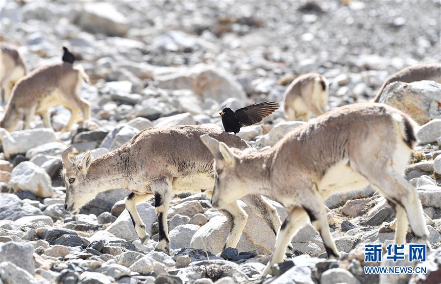 黃嘴山鴉停留在巖羊身上(5月8日攝)。當日,一群巖羊在珠峰大本營周圍覓食,黃嘴山鴉飛到巖羊身上停留,構(gòu)成一幅幅生動有趣的雪域圖畫。新華社記者晉美多吉攝