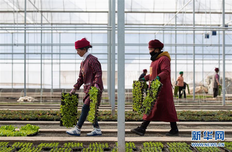 在位于昭覺縣四開鄉(xiāng)好谷村的涪昭現(xiàn)代農(nóng)業(yè)示范園區(qū),當?shù)卮迕裨谑卟舜笈锢飫谧鳎?019年12月10日攝)。新華社記者江宏景攝