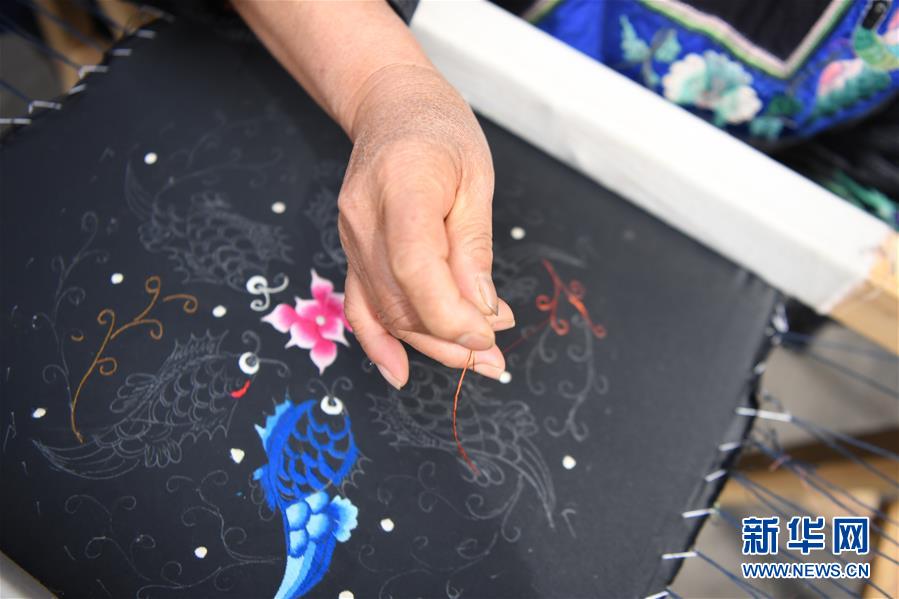吳美金在十八洞村苗繡特產(chǎn)農(nóng)民專業(yè)合作社繡苗繡(4月24日攝)。1967年出生的吳美金,1992年嫁入飛蟲村(現(xiàn)十八洞村飛蟲寨)時(shí),只有爛泥路的飛蟲村不僅田土少,掙錢活路也少,生活十分困難。2014年,吳美金加入了十八洞村苗繡特產(chǎn)農(nóng)民專業(yè)合作社,從小就會(huì)的苗繡傳統(tǒng)手藝如今成了家庭增收的法寶,不僅在家門口就把錢掙了,同時(shí)還能照顧年幼的孫子孫女?!艾F(xiàn)在的日子,比年輕的時(shí)候好多了?!眳敲澜鹫f(shuō)。新華社記者薛宇舸攝