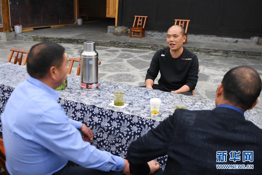 楊正邦(中)在和來(lái)自浙江的住客攀談(4月25日攝)。楊正邦1978年出生于十八洞村,在外打工多年。近些年,眼看來(lái)十八洞村的游客越來(lái)越多,村里越來(lái)越熱鬧,楊正邦在2017年結(jié)束自己的打工生涯回鄉(xiāng)發(fā)展。他先是在村里擺起小吃攤,2018年開起農(nóng)家樂,去年又搭起新房子擴(kuò)建成民宿,年度家庭人均純收入從2014年的1923元增加到2019年的7173元。新華社記者薛宇舸攝