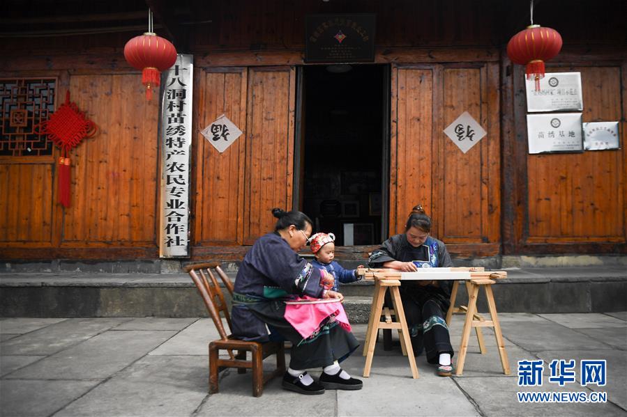 吳美金(右一)在十八洞村苗繡特產(chǎn)農(nóng)民專業(yè)合作社繡苗繡(4月24日攝)。1967年出生的吳美金,1992年嫁入飛蟲村(現(xiàn)十八洞村飛蟲寨)時(shí),只有爛泥路的飛蟲村不僅田土少,掙錢活路也少,生活十分困難。2014年,吳美金加入了十八洞村苗繡特產(chǎn)農(nóng)民專業(yè)合作社,從小就會(huì)的苗繡傳統(tǒng)手藝如今成了家庭增收的法寶,不僅在家門口就把錢掙了,同時(shí)還能照顧年幼的孫子孫女?!艾F(xiàn)在的日子,比年輕的時(shí)候好多了?!眳敲澜鹫f(shuō)。新華社記者薛宇舸攝