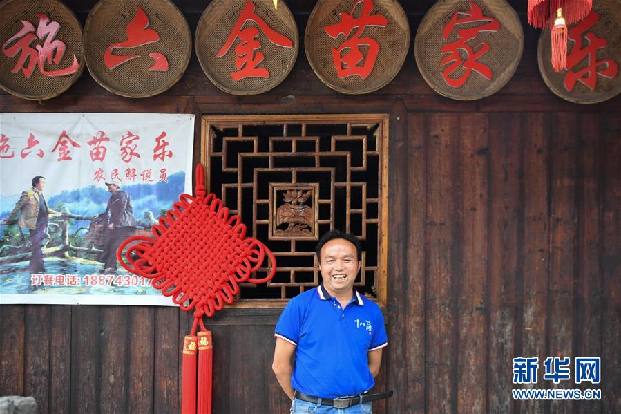這是施六金在他的農(nóng)家樂前留影(4月25日攝)。1973年出生于十八洞村的施六金,由于父親患病很早就放棄學(xué)業(yè)和母親扛起了家庭的重擔(dān)。為了生活,他還曾遠去東南亞打工。2015年,看到家鄉(xiāng)的變化,施六金回到村里開起了農(nóng)家樂,年度家庭人均純收入也從2014年的1715元增長到了2019年的35696元。2018年,施六金與心愛的人組建了家庭。今年初,施六金與愛人迎來了一個大胖小子?!白鋈俗鍪乱没貓蠛透卸鳌!笔┝鸾o剛出生的兒子取名施澤恩。新華社記者薛宇舸攝