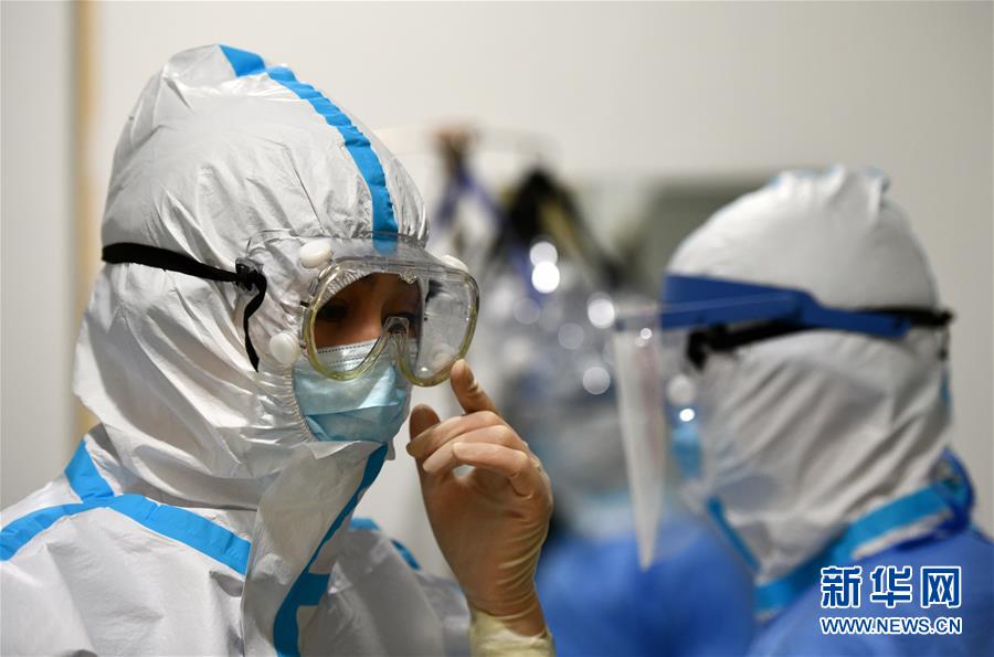 5月11日,在空港醫(yī)院隔離病房,穿戴好防護(hù)服的醫(yī)護(hù)人員準(zhǔn)備進(jìn)入“紅區(qū)”。