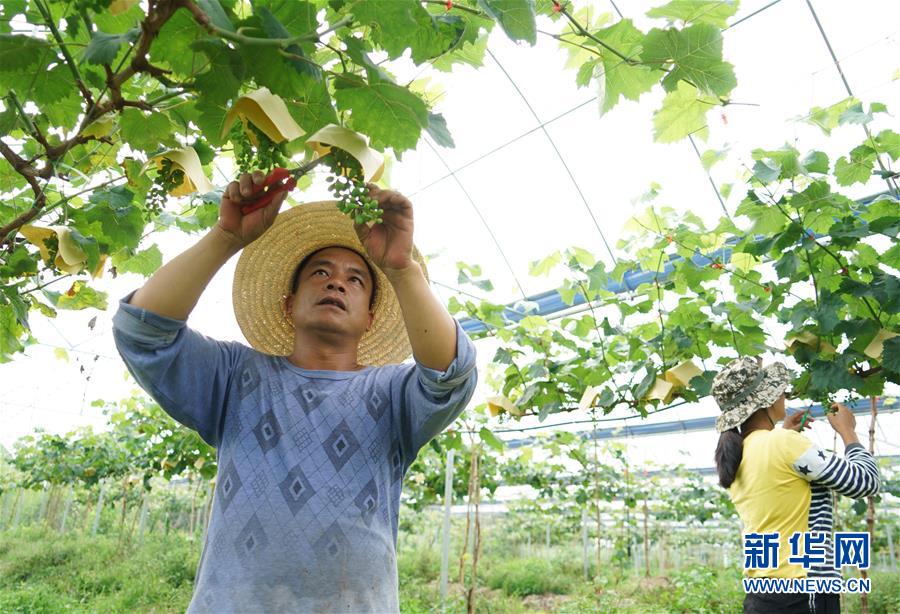 5月13日,在福建省建甌市小橋鎮(zhèn)陽澤村誠(chéng)源果蔬專業(yè)合作社,村民在修剪葡萄枝葉。誠(chéng)源果蔬專業(yè)合作社有葡萄園100多畝,產(chǎn)品供應(yīng)北京上海市場(chǎng),村民可以在葡萄園內(nèi)從事季節(jié)性工作。新華社記者賀燦鈴攝