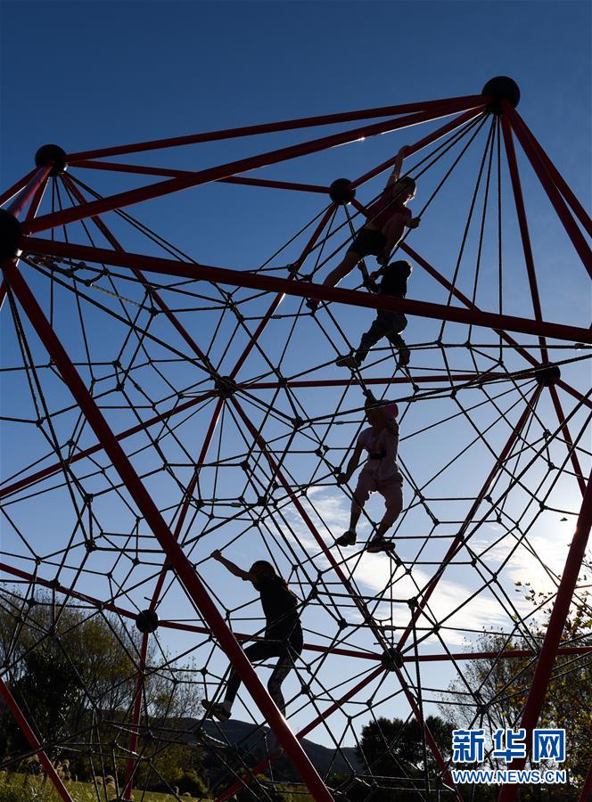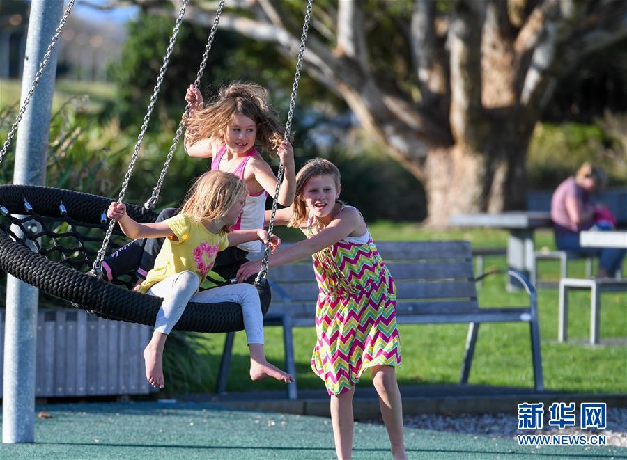 5月14日,孩子們在首都惠靈頓郊外公園的游樂場玩耍。當天是新西蘭從新冠疫情防控響應三級下調(diào)到二級的第一天,經(jīng)濟活動全面重啟,公園等公共設施首次重新開放,中小學生將于5月18日全面返校復課。新華社記者郭磊攝