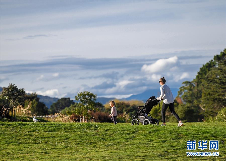 5月14日,在新西蘭首都惠靈頓郊外的公園,一名女子推車帶著孩子穿過草地。當天是新西蘭從新冠疫情防控響應三級下調(diào)到二級的第一天,經(jīng)濟活動全面重啟,公園等公共設施首次重新開放,中小學生將于5月18日全面返校復課。新華社記者郭磊攝