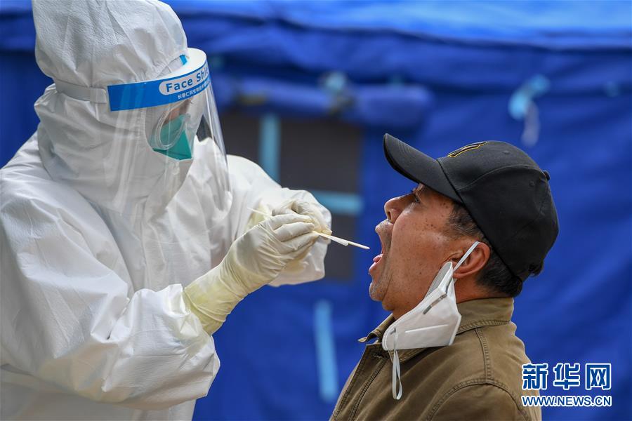 5月15日,在舒蘭市建馨園小區(qū),工作人員為居民采集咽拭子。當(dāng)日,從吉林市7家市直醫(yī)院抽調(diào)的300名護(hù)士經(jīng)培訓(xùn)后,全部投入到舒蘭市(隸屬于吉林市)核酸采樣工作中。為提供追溯傳染源所必需的核酸檢測(cè)相關(guān)數(shù)據(jù),舒蘭市根據(jù)確診病例的活動(dòng)軌跡,將流調(diào)和核酸檢測(cè)范圍擴(kuò)大至本地確診病例和無癥狀感染者的次密接人員及一般接觸者。新華社記者張楠攝