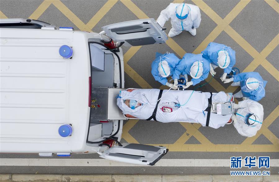 在華中科技大學(xué)附屬同濟(jì)醫(yī)院中法新城院區(qū),醫(yī)護(hù)人員護(hù)送一名剛做完CT檢查的新冠肺炎重癥患者上負(fù)壓救護(hù)車(3月6日攝,無人機(jī)照片)。新華社記者才揚攝