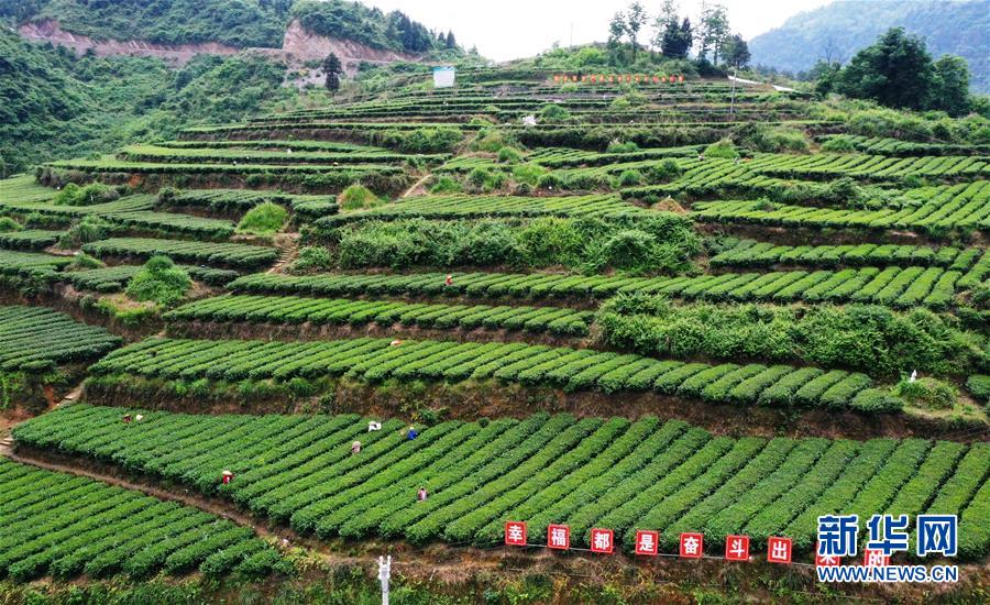 5月17日,村民在新院村茶葉基地采摘夏茶(無(wú)人機(jī)照片)。新華社記者王全超攝