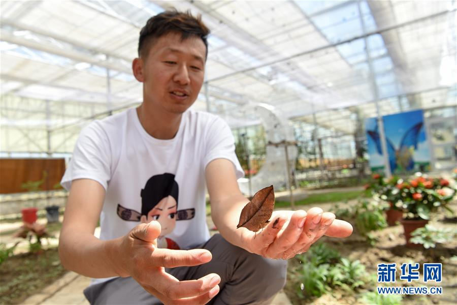 在吉木薩爾縣七彩蝶園,關富云向游客介紹養(yǎng)殖的枯葉蝶(5月15日攝)。新華社記者丁磊攝