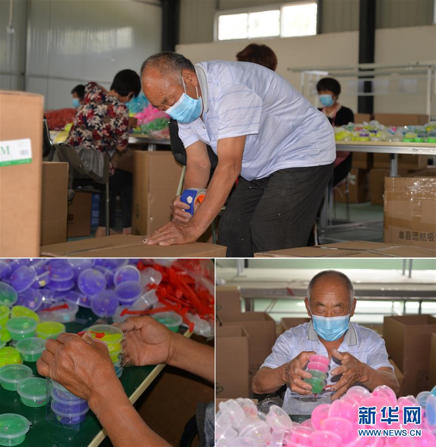 這是一張拼版照片(圖片均為5月16日攝)。上圖:在河南省開封市尉氏縣大橋鄉(xiāng)馮村扶貧車間,65歲的鄭春嶺用膠帶把裝滿玩具的紙箱封上。依靠村內(nèi)扶貧車間,他走上致富的道路;下左圖、下右圖:鄭春嶺在打包玩具。新華社記者孫清清攝